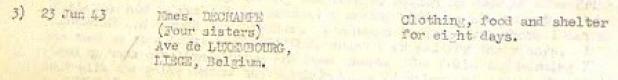 Dans l’autre partie de son rapport, Cole indique qu’il reste caché dans une ferme à Neerpelt pendant 1 jour et demi et que pendant ce temps il a rencontré un homme venu de Liège et qui prit contact avec une organisation dans cette ville. Le jour suivant, une jeune dame arrive pour le conduire à Hasselt. Il peut se raser et prendre un bain chez la dame, qui s’occupe de lui procurer des tickets de train avant de le mener à la gare. Là, il prend un train pour Liège, accompagné d’un "représentant de la Résistance" et de son bombardier Hugo. Ce dernier mentionne pour la date du 22 juin qu’une "Margaret" les a accompagnés depuis les environs de Neerpelt jusqu’à la gare de Neerpelt avec PEETERS. Hugo précise que cet homme (PEETERS, donc) les mène vers l’endroit où il loge à Liège et où habitent trois servantes très âgées (les "quatre sœurs" dont parle Cole ?). Dans un récit rédigé il y a quelques années par Frank Hugo et que nous a fait parvenir John Clinch, Frank indique qu’il a été hébergé pendant environ 10 jours chez les sœurs "Deschance, Josephine, Hermine, Maria et …?", Cole allant ailleurs… Nous avons pu retrouver mention d’une Mlle Joséphine DECHANXHE, "Avenue de Leix, Liège" dans la Liste des Helpers belges et dont Hugo dit dans son récit que Joséphine est l’aînée des quatre sœurs en question, l’adresse devant bien être Avenue du Luxembourg car il n’y a aucune Avenue de Leix à Liège. Mais mystère ici, car c’est Cole qui, en octobre 1945, déclare avoir logé chez elles… Voici les extraits des pages "Appendix A" de leurs Rapports Lib respectifs :