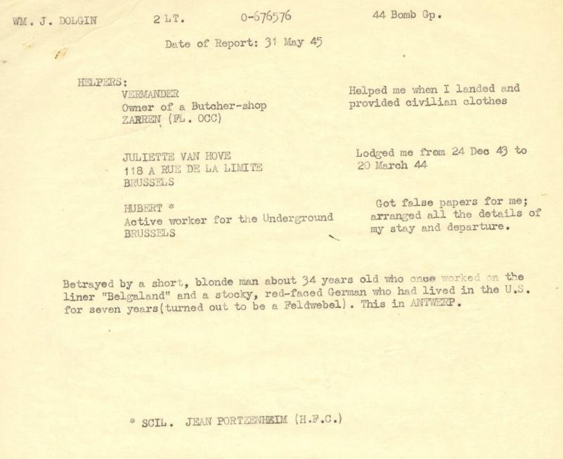 Dolgin raconte qu'il était en compagnie de Dzwonkowski et Akins la majeure partie du temps qu'ils étaient en fuite en Belgique... jusqu'à ce que Jean PORTZENHEIM, mis en confiance, ne les transfère involontairement vers la "fausse ligne KLM" le 23 mars.