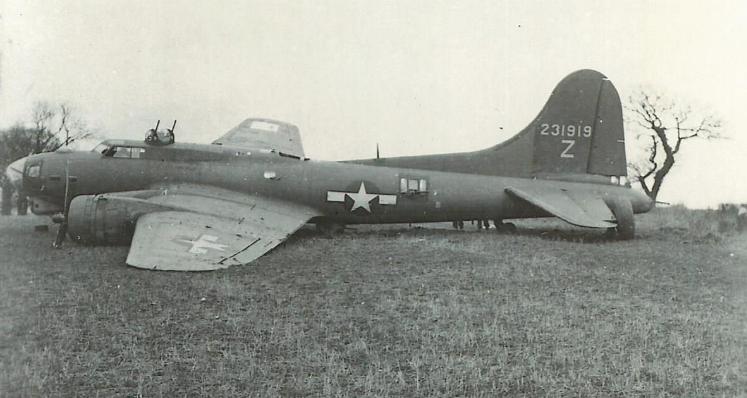 Le B-17 décolle de Deopham Green. William E. Elsberry (mitrailleur supérieur et mécanicien de bord) faisait partie de l'équipage du 2nd Lt Robert C. Schimmel. De retour d'une mission sur Berlin le 6 mars 1944, ce B-17G déjà endommagé par la Flak a été attaqué à hauteur de Schoonebeek, près d'Emmen en Hollande par des Messerschmitt 109. Le moteur n°4 a pris feu. Malgré la mise en drapeau de l'hélice, le feu a continué et de crainte d'une explosion, le pilote a ordonné à son équipage de sauter. Le moteur s'est ensuite désolidarisé de l'aile et est tombé. Le pilote a continué seul à bord et a fait un atterrissage forcé à Metfield en Angleterre avant de rejoindre sa base de Deopham Green.