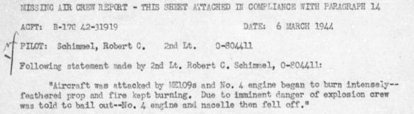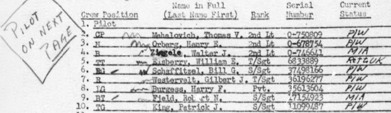 Le 2nd Lt Walter Jean Ziegele (bombardier) s'est tué à Zuidbarge, près d'Emmen, Drenthe, Pays-Bas (parachute non ouvert ?). D’abord inhumé au cimetière de Nieuw-Dordrecht le 10 mars, ses restes ont été transférés après la guerre au Cimetière Américain à Margraten, Pays-Bas. Les autres (repris dans l’extrait du MACR ci-dessus) ont été faits prisonniers, sauf le T/Sgt Elsberry qui est parvenu à éviter la capture.