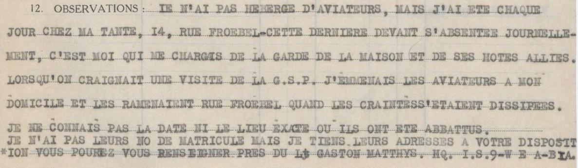 Les deux évadés y reçoivent des visites de Marguerite GILBERT ("Margaret"), qui habite au "18 Rue du Botanique" et qui est la fille célibataire de L. W. Gilbert, britannique, époux d’Anne DE VEUSTER, la sœur de Claire. [ L’Almanach de Bruxelles pour 1939 reprend un J. Gilbert, au n° 28 Rue Botanique…] Agée de 19 ans, Marguerite confirme dans son rapport d’activités (où elle reprend les noms de 17 aviateurs, dont Freudenberger et Goewey) :