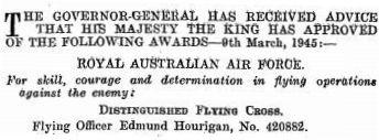 En mars 1945, Edmund Hourigan s’est vu décerner la DFC (Distinguished Flying Cross) pour services rendus :
