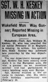 Sa sœur écrivit à Carmen DALMOTE le 26 février 1945 de Palmer, Michigan, pour lui signaler que William est maintenant prisonnier de guerre, mais qu'il n'est pas blessé et en bonne santé. Raymond Walls écrit également à Carmen DALMOTE le 24 mars 1945 depuis Monongah, West Virginia, et confirme que Keskey a été arrêté.