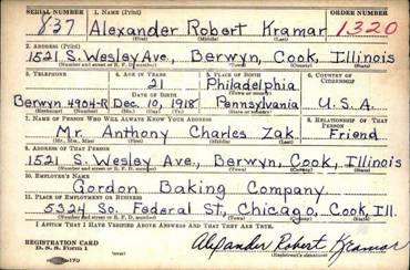 En fait, selon sa "Draft card" (carte d’enrôlement le 16 octobre 1940 à Berwyn, Illinois), son nom complet était Alexander Robert Kramar : Son père était Alexander Kramarinko (parfois orthographié Kramarenko…). Lors de son engagement comme Aviation Cadet dans l’US Air Corps à Chicago, Illinois le 10 novembre 1941 (matricule 16035409), il est repris comme Kramarinko, tout comme dans sa fiche de Prisonnier de guerre. Vu le contexte de la guerre froide dès 1946, il aura préféré Kramar pour éviter toute connotation avec la Russie…