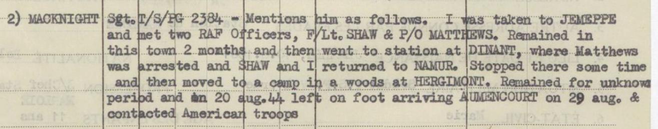 Toujours selon MacKnight, après avoir été caché un certain temps à Namur, il a été transféré vers un camp à "Hergimont" (ce pourrait être plutôt Orchimont, un village un peu au nord-est de Bohan…) Après une période indéterminée, il est parti à pied, le 20 août 1944, est arrivé le 29 à "Aumencourt" où il est entré en contact avec des troupes US. Ces maigres détails ne confirment que vaguement ce qui figure dans les archives de l’Opération "Marathon" et des rapports d’autres évadés (voir ci-dessous), car Macknight figure bien dans la liste des aviateurs cachés au camp de Bohan.