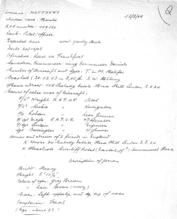 Les autres, comme Harold Matthews (la présente fiche) parviendront un temps à s’évader, mais seront tous arrêtés ultérieurement. L’opérateur radio F/S William Robert John Dingle, atterri près de Alken, est hébergé chez des bûcherons à Alken où il est rejoint le 22 décembre par le mécanicien F/S William McRae Sinclair. Les deux hommes sont ensuite cachés dans la région de Tongeren (Tongres) puis, via Rekkem qu’ils rejoignent à vélo, ils sont guidés vers Liège où ils reçoivent de faux papiers. Ils sont rejoints par un autre évadé, un navigateur hollandais d’une autre escadrille de la RAF et prennent tous trois un train en direction de Bruxelles le 6 janvier 1944. Contrairement à ceux de Dingle et Sinclair, les papiers du navigateur ne sont pas en ordre et tous se font arrêter lors d’un contrôle à bord. Leur jeune guide peut s’échapper, mais on apprendra plus tard que lui aussi se fera appréhender et sera envoyé en Allemagne.