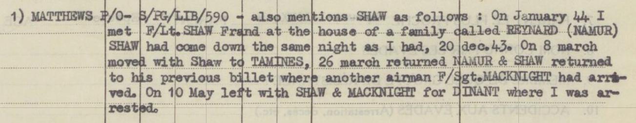 Nous reprenons ci-après ce qui figure dans d’autres archives : Le 10 mai 1944, alors qu’il est accompagné par Gladys Pollaris, Matthews monte en gare de Namur à bord d’un train (probablement en direction de Dinant et de là vers un camp secret dans les Ardennes) Un contrôle d’identité se passe apparemment mal, car Gladys et ses "colis" doivent descendre du train. Le rapport de Matthews indique qu’il avait fait le voyage avec Frank Shaw et Jack Macknight et que seul lui avait été arrêté à ce moment…