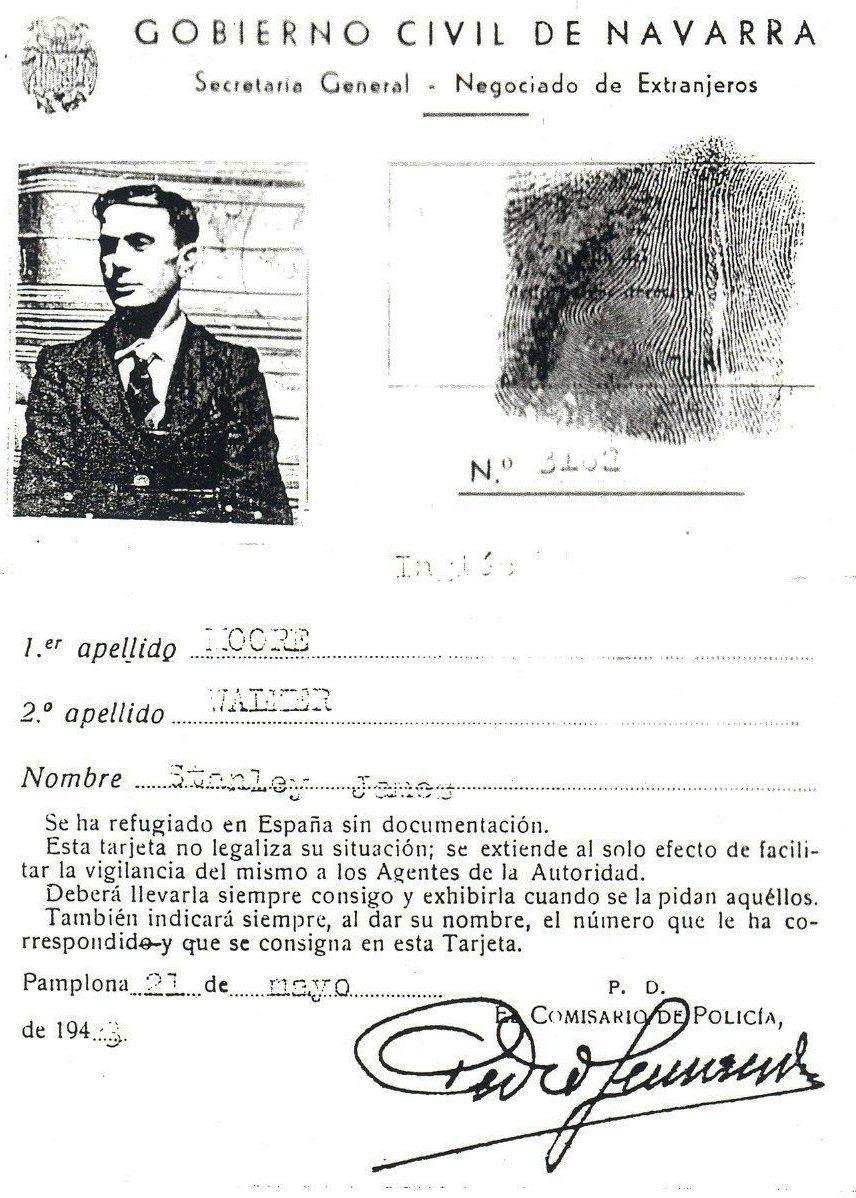 Ce 19 mai à 23 heures, ce fermier leur dit qu'il connaît un passeur qui demande 25.000 FF. Comme ils n'ont que 3.000 FF et 1.000 Pesetas ... le guide accepte cette somme et la montre-bracelet de Moore. Il vient avec un camarade et Moore, Ferguson et leur guide partent à minuit. Moore avait cogné sa cheville et avait du mal à marcher. Le 20 vers 06 heures, ils passent en Espagne près du Pic de Lakhoura, passant vraisemblablement par les gorges d'Ujarre. Moore va dans une hutte et confirme qu'ils sont en Espagne. Pendant qu'ils se lavent, des Guardia Civile les arrêtent. Les Français traduisent et ils avouent être des aviateurs. A 16 heures, ils sont conduits à Isaba et enfermés dans une geôle bien sale. Le lendemain à 15 heures, on les conduit en bus à Pampelune, où ils refusent de répondre aux questions et exigent de voir le consul britannique de Madrid. Ils vont à la prison de Pampelune et apprennent plus tard que la Croix-Rouge américaine reçoit leur lettre adressée à l'ambassade de Madrid mais ne fait pas poursuivre.