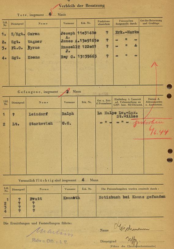 Byrne, Starkovich, Caron, Koons et Wagner sont morts de blessures en hôpital de la Luftwaffe à Saint-Gilles, Bruxelles le 6 juin. Byrne et Starkovich reposent au Cimetière Américain des Ardennes à Neupré ; les restes des autres ont été rapatriés aux États-Unis.