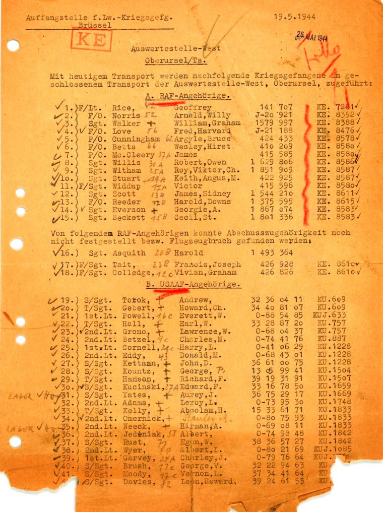 Geoffrey Rice est repris comme "Sorti de EVA le 31 mai 1944 (91 jours)" sur une liste, une autre fiche indique sa sortie le 28 avril 44, date de sa remise à Jean PORTZENHEIM qui le confie à Marcel DAELEMANS pour évacuation vers la ligne KLM. Jeanne VAN TUYKOM le guide le 28 avril avec Earl Hall, Lawrence Grono, Everett Powell et Benjamin Ochart, pour les remettre à Charles DAELEMANS. Peu après leur arrivée à Anvers, le groupe est arrêté, pris dans le piège tendu par le traître belge René Van Muylem.