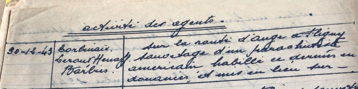 Smith atterrit le 30 décembre 1943 vers 11 h 45 au Nord-Est de Chimay, selon son rapport. En fait, il est recueilli par, Louis CORBINAIS, douanier français travaillant pendant la guerre à Fligny dans les Ardennes, "sur la route d'Auge à Fligny. Sauvetage d'un parachutiste américain. Habillé ce dernier en douanier, et mis en lieu sûr". Le carnet du groupe de FFI cite également les noms de Leroux, Henaff, et Barbier.