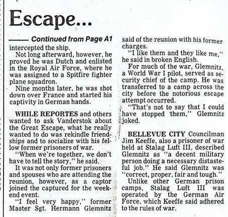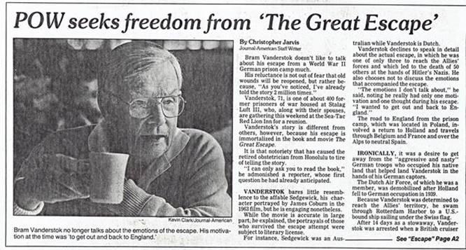 Dans cette interview après une réunion d’anciens prisonniers aux États-Unis, VAN DER STOK déclare ne plus trop vouloir parler de sa détention et de son évasion, racontée "2 millions de fois" et relatée dans son livre. Il ajoute qu’il préfère la compagnie d’autres prisonniers. "Quand nous nous retrouvons, nous n’avons pas besoin de raconter l’histoire (de "La Grande Evasion")… "